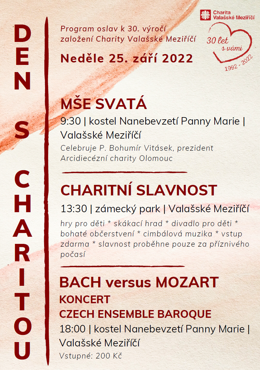 Charita Valašské Meziříčí slaví v letošním roce 30. výročí od jejího založení. Příští neděli 25. září se uskuteční ve Valašském Meziříčí Den s Charitou, na který jste všichni srdečně zváni.